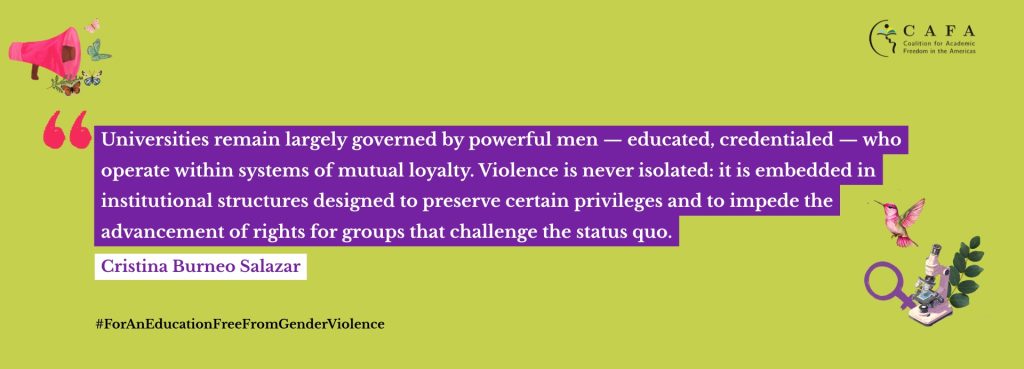 “Gender-based violence in universities — transphobia, homophobia, machismo — means that students, administrative staff, and women professors enter these spaces already at a disadvantage,” she states.