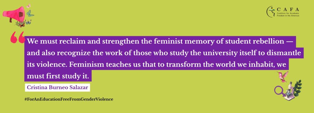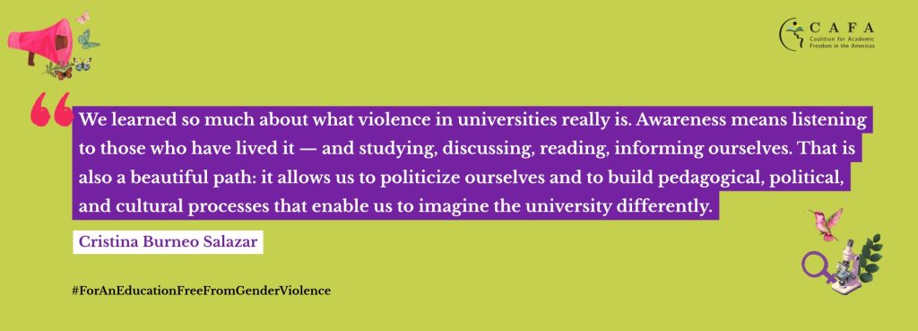 Cristina Burneo Salazar – I want to underscore that in recent years, reporting gender-based violence in universities — whether ideological persecution, sexual violence, or sexual harassment — has become a struggle in itself. These complaints have mostly been driven by women, but they increasingly reveal other forms of violence too, including homophobia and transphobia.